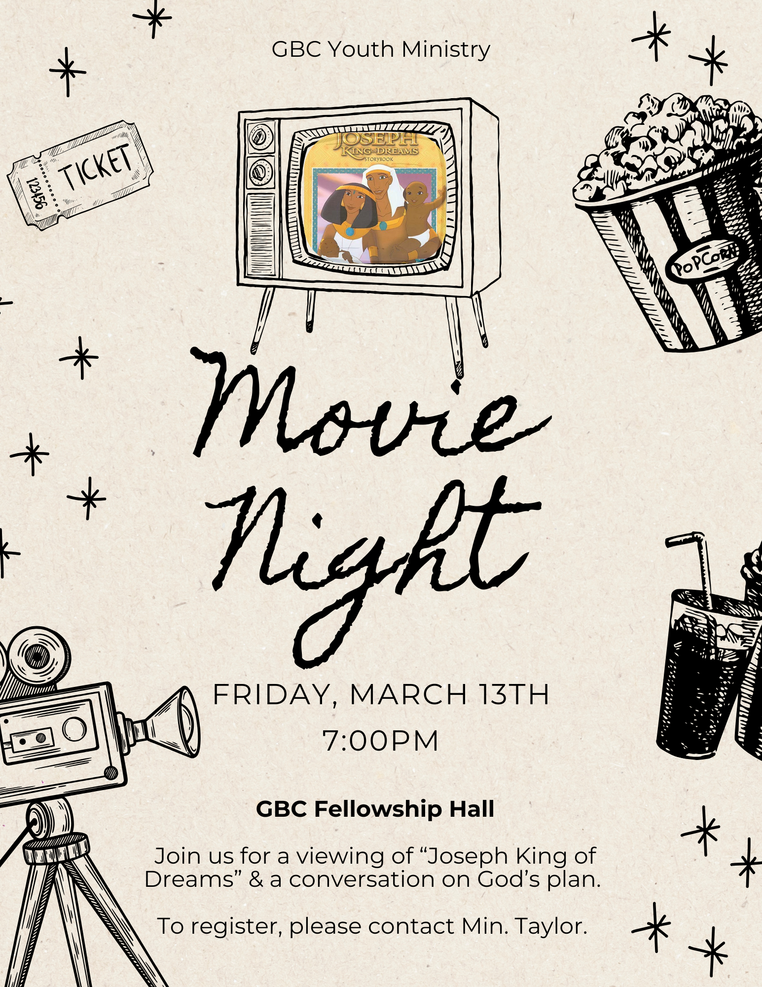 Join us Friday, March 13, 2026 at 7:00 PM (Fellowship Hall):for a wonderful time of fellowship and discussion on this wonderful movie adventure of Joseph's life!